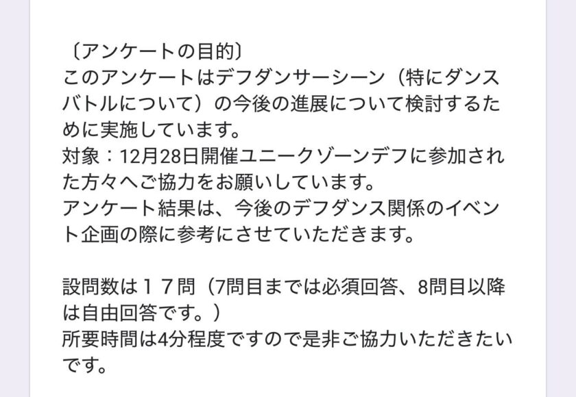 本アンケートは、デフダンサーシーン、特にダンスバトルの今後の展開について検討するために実施しています。